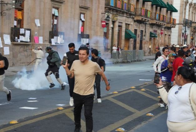 Durante la protesta, un grupo intentó derribar las láminas metálicas que protegen la puerta principal del Palacio de Gobierno, lo que desató un enfrentamiento con agentes antimotines de la Guardia Civil. Los uniformados respondieron con gas lacrimógeno y balas de goma para dispersar a los participantes.